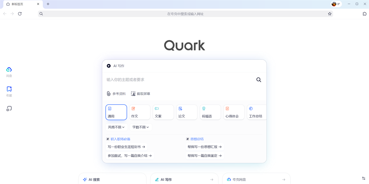 夸克浏览器PC版,你的AI搜索,全新的超级搜索框。能搜知识、找经验、查询健康问题,AI整理全网内容,生成优质回答;能一键写作创作,支持多种文案类型与字数要求;还能快速总结文件和视频…